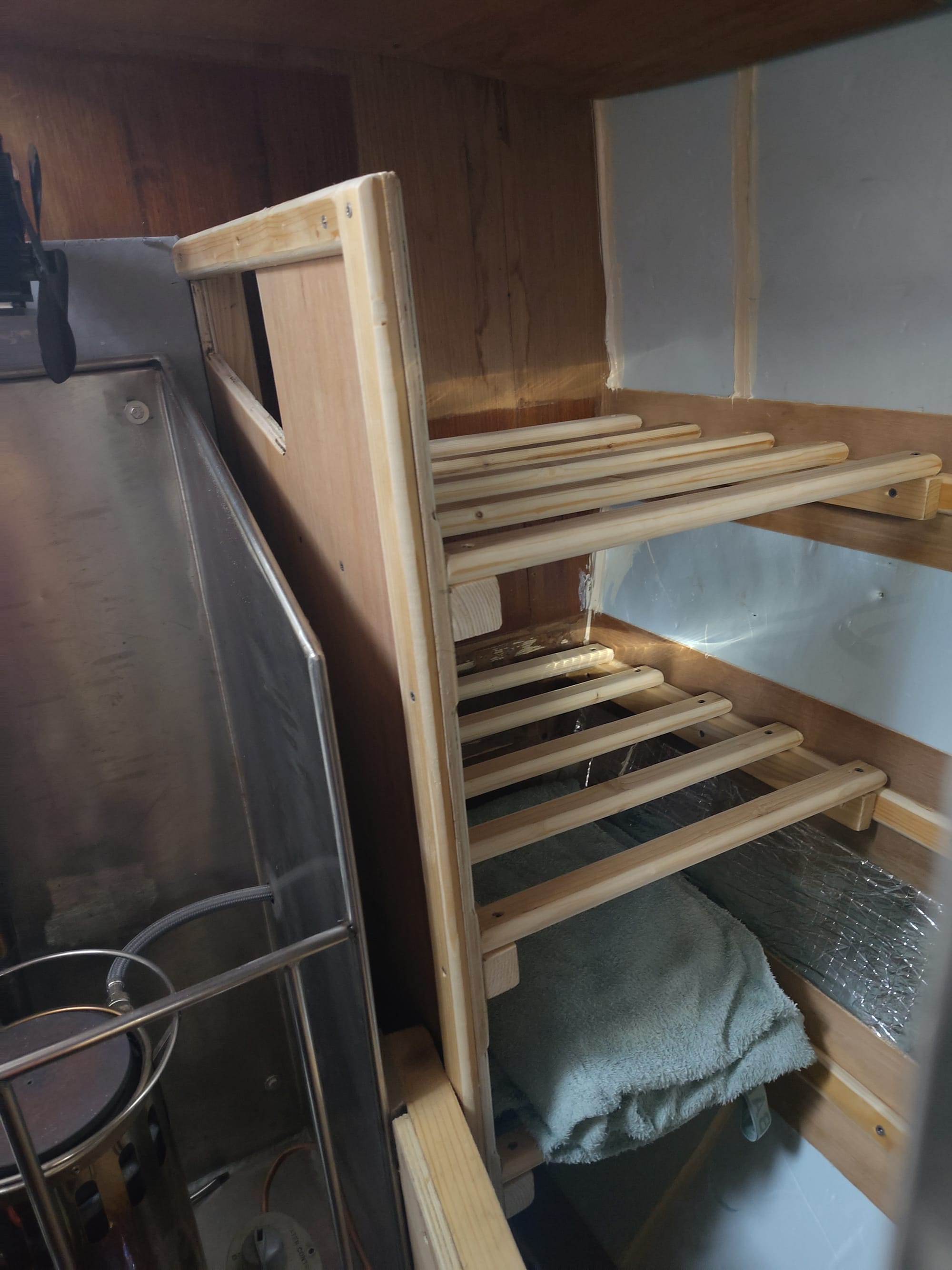 We got the insulation fitted to the underside of the deck above the airing cupboard. Then I built the supports and shelves for the actual airing cupboard. I'm quite pleased with it. I have rounded all four edges of each of the shelf slats, so things should slide in and out without snagging.