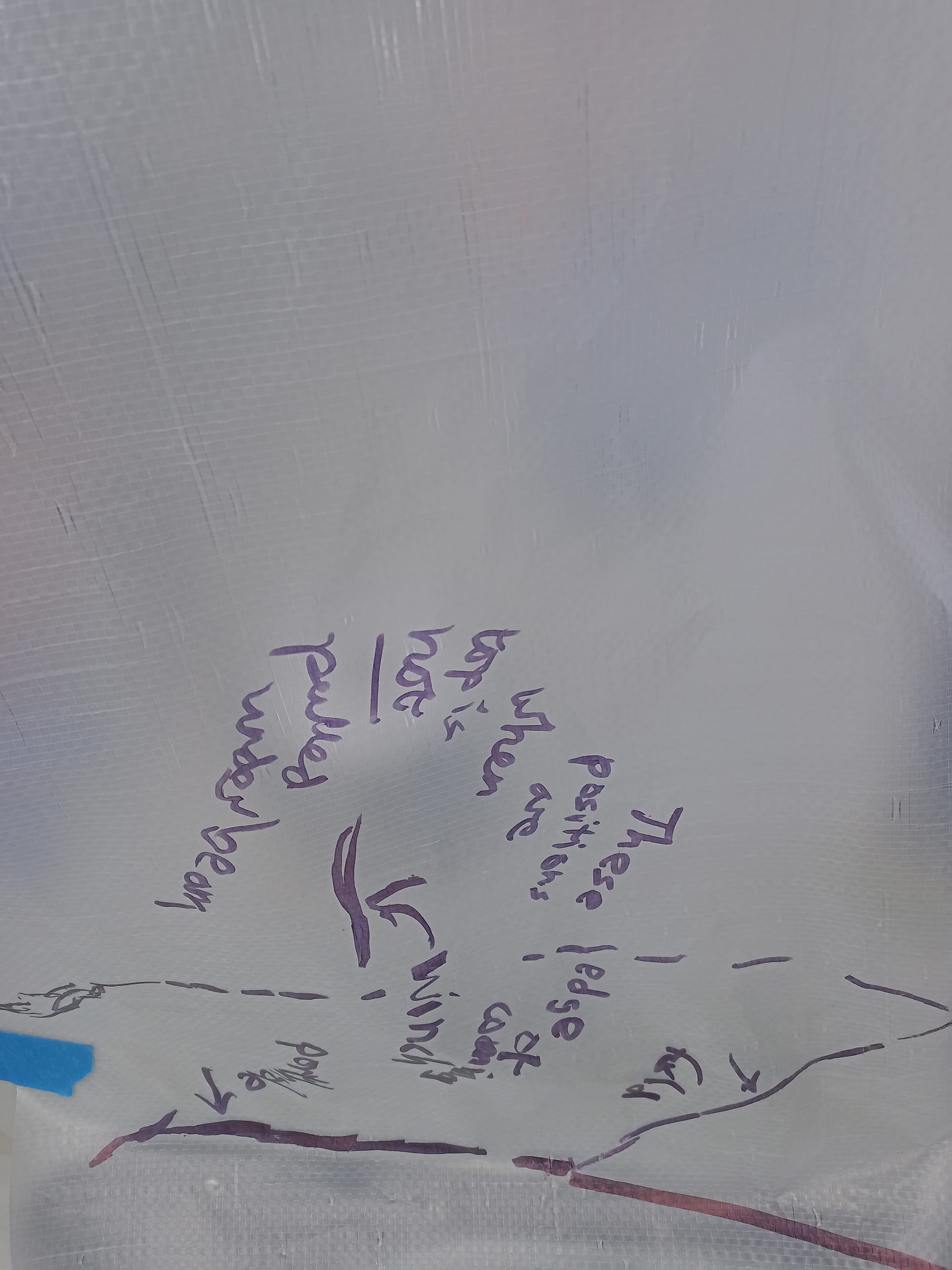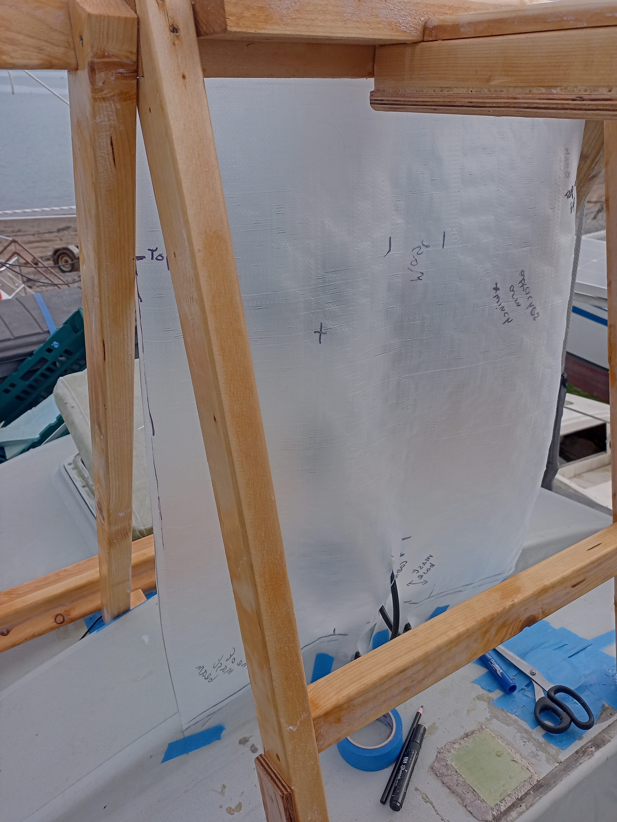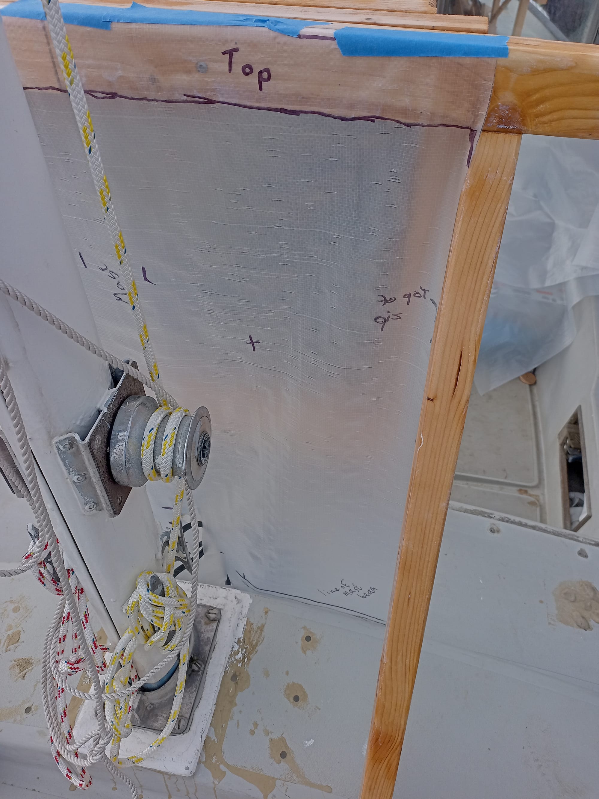 It seems extremely complicated to me. All these corners, off angles, cut-outs for the support legs and for cables and later for winches. Some sides zip on, others are held by twist locks, others by elastic that goes from eyelets on the canvas around hooks on the boat.