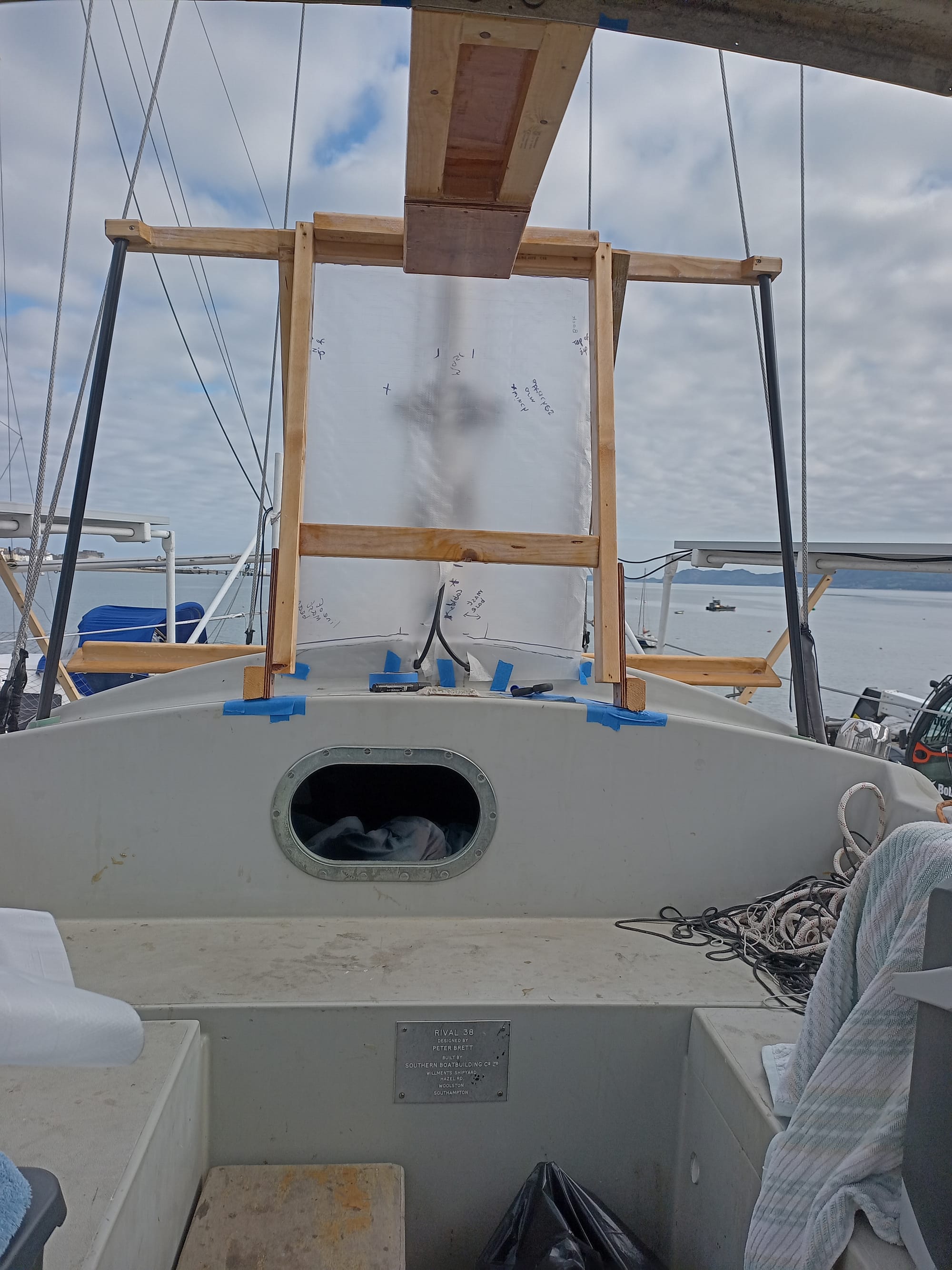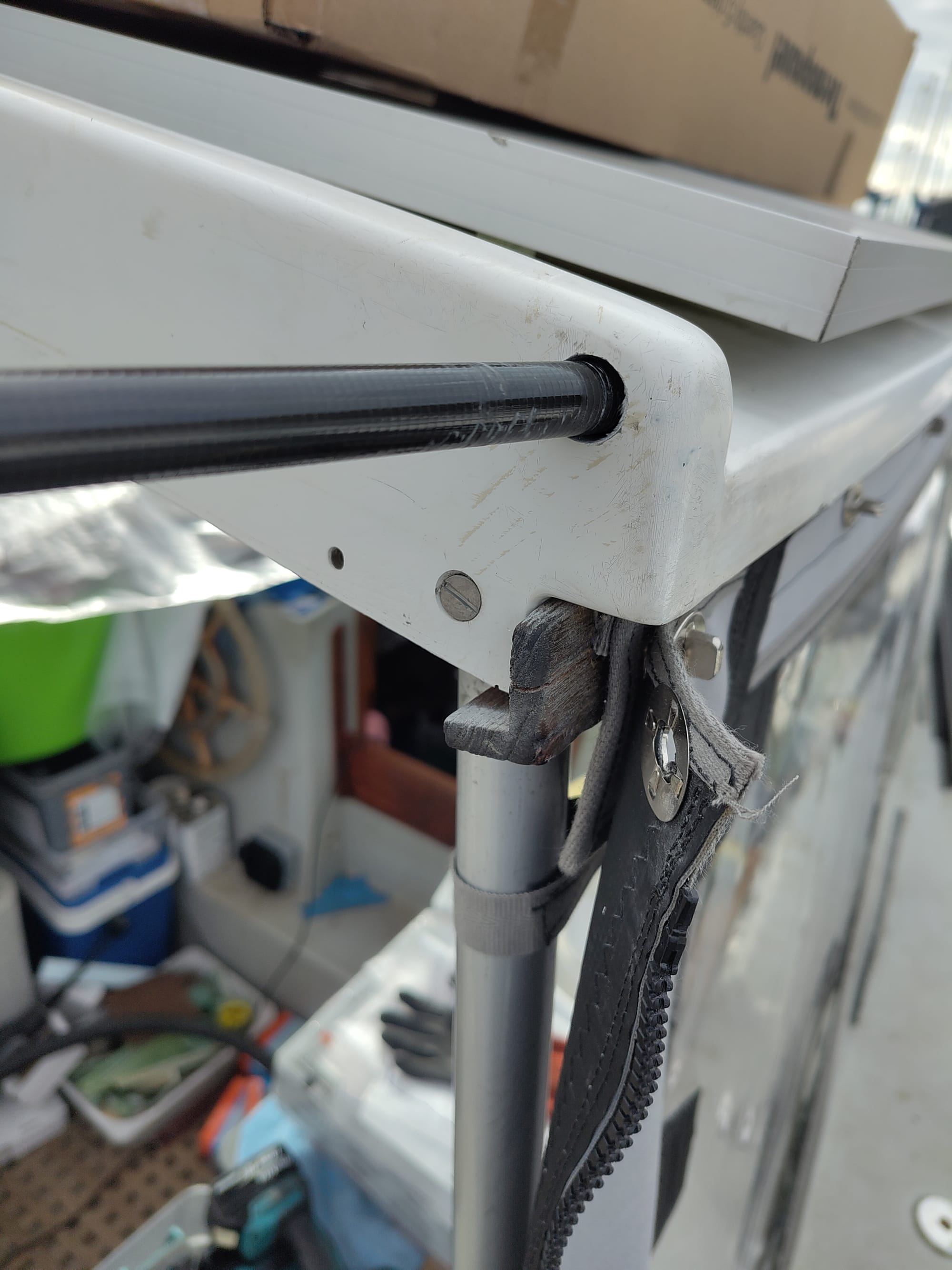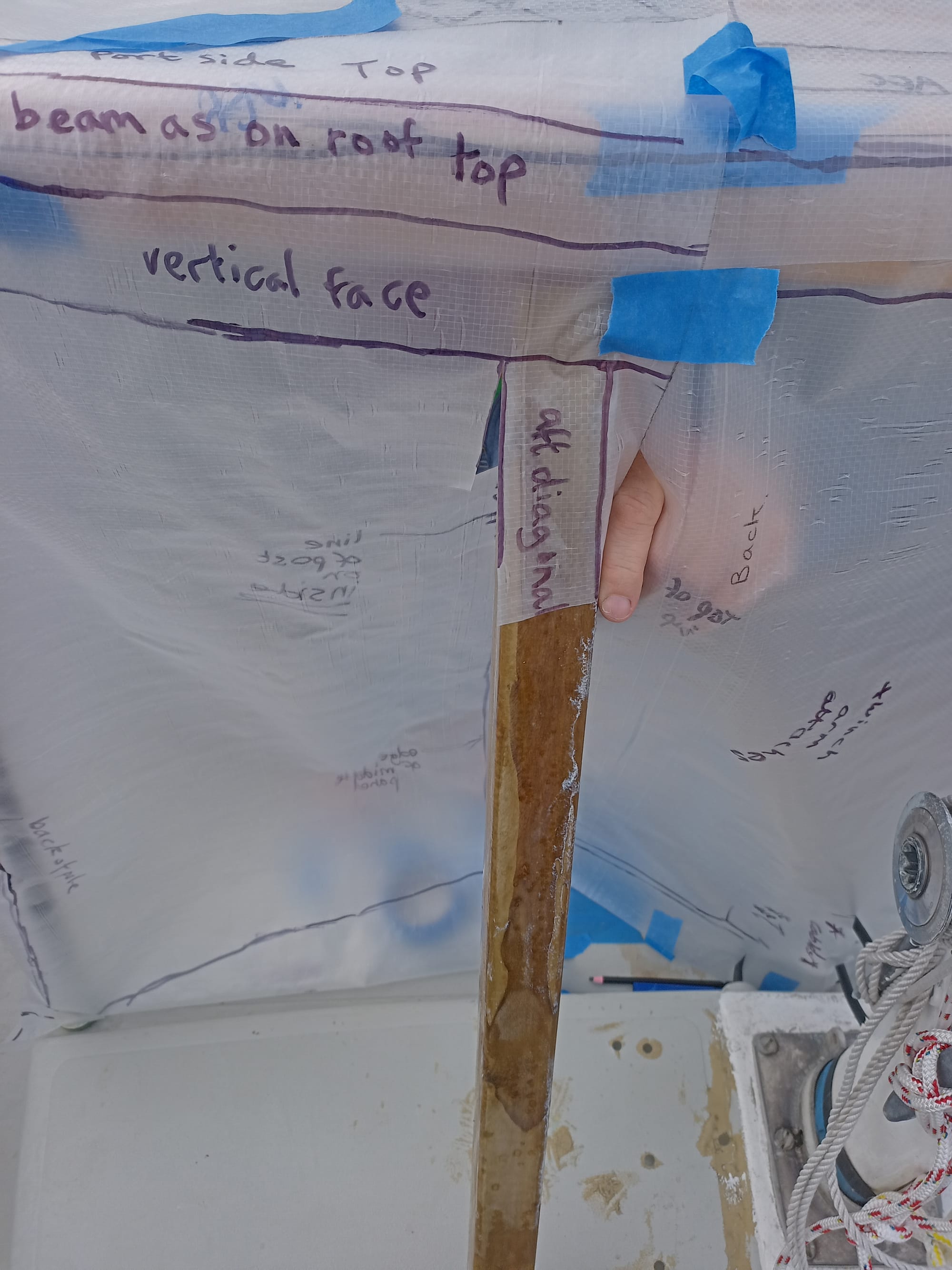 It seems extremely complicated to me. All these corners, off angles, cut-outs for the support legs and for cables and later for winches. Some sides zip on, others are held by twist locks, others by elastic that goes from eyelets on the canvas around hooks on the boat.