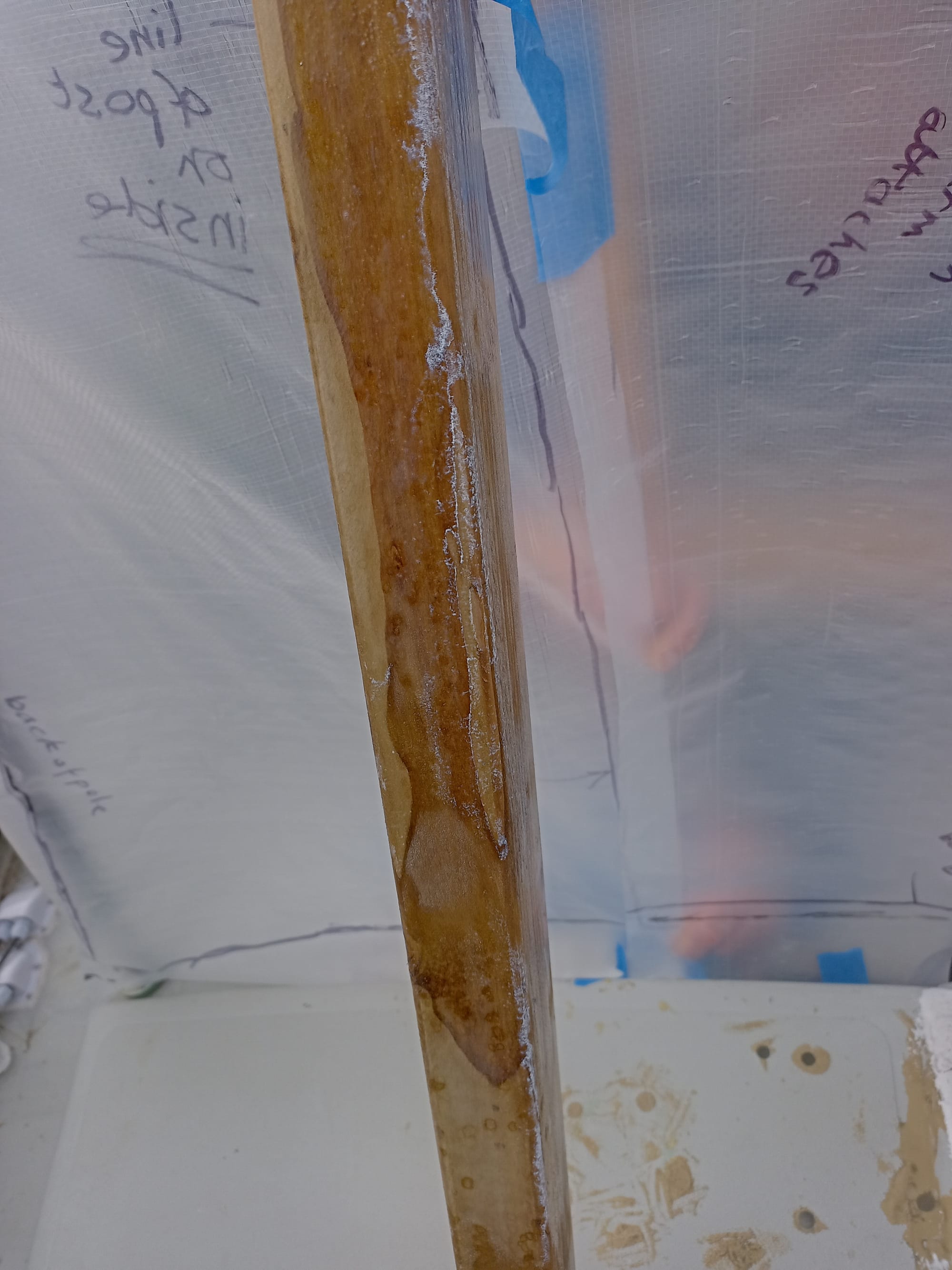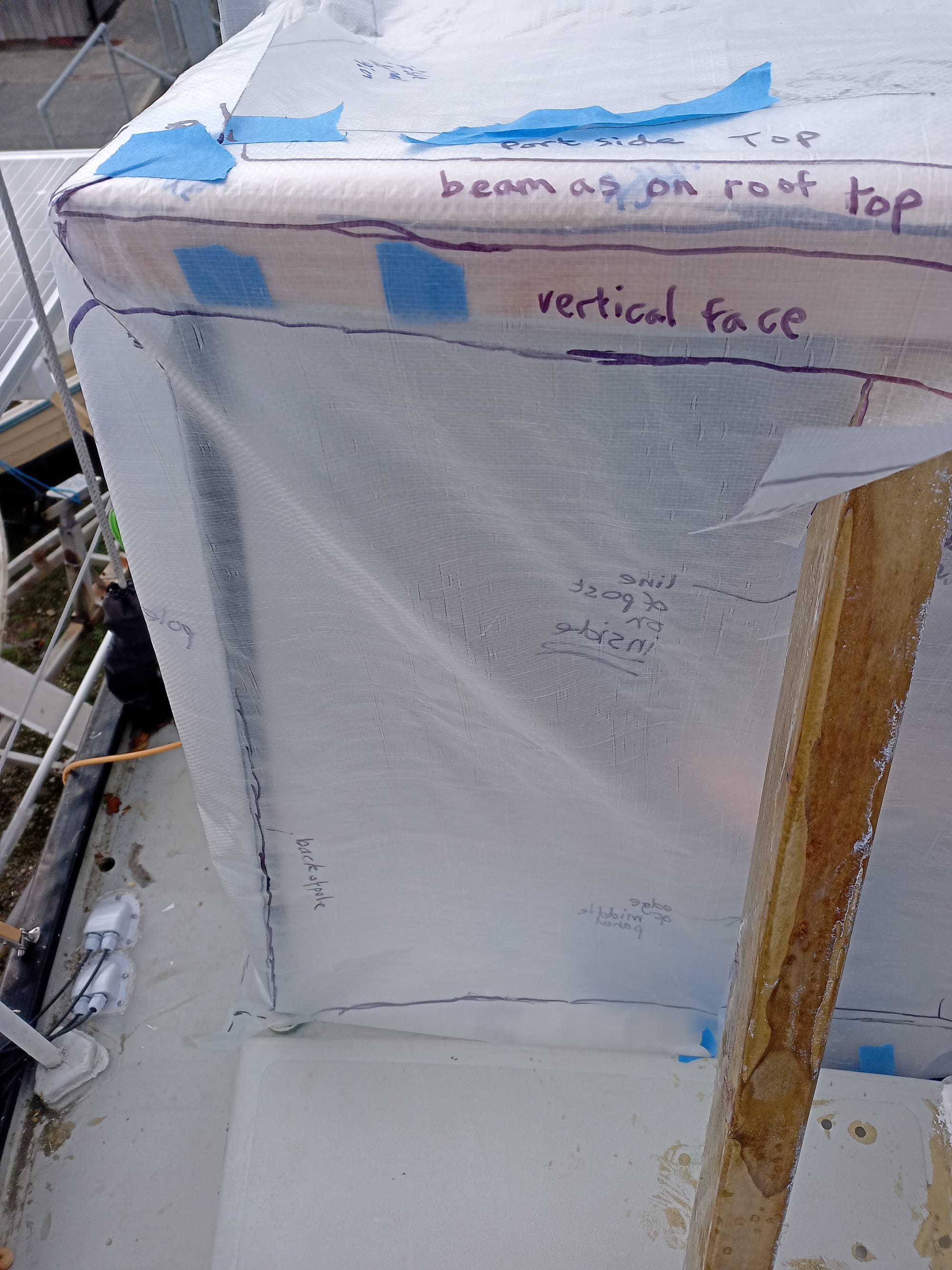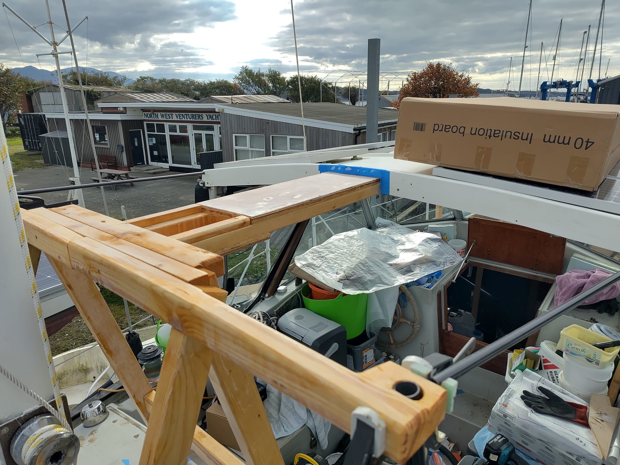 Then Jane started preparing the timber of the wheelhouse extension for another coat of epoxy. It was a bit cold and damp when we did the first coat so it has a white blush finish which we will sand a little now that she has washed off any amines (a chemical residue).