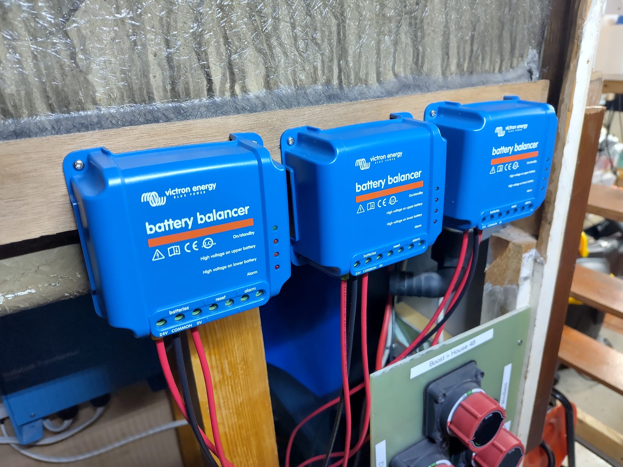 We tackled a problem that one of the four main house batteries appeared to be discharging fully without the other 3 connected batteries doing much at all. So we have swapped the order of the batteries and installed battery balancers. This was one of the most complicated wiring jobs.